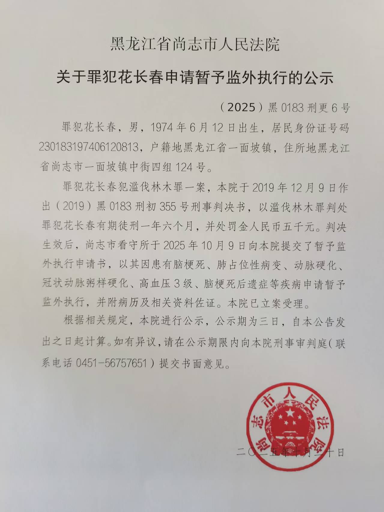黑龙江省尚志市人民法院关于罪犯花长春申请暂予监外执行的公示