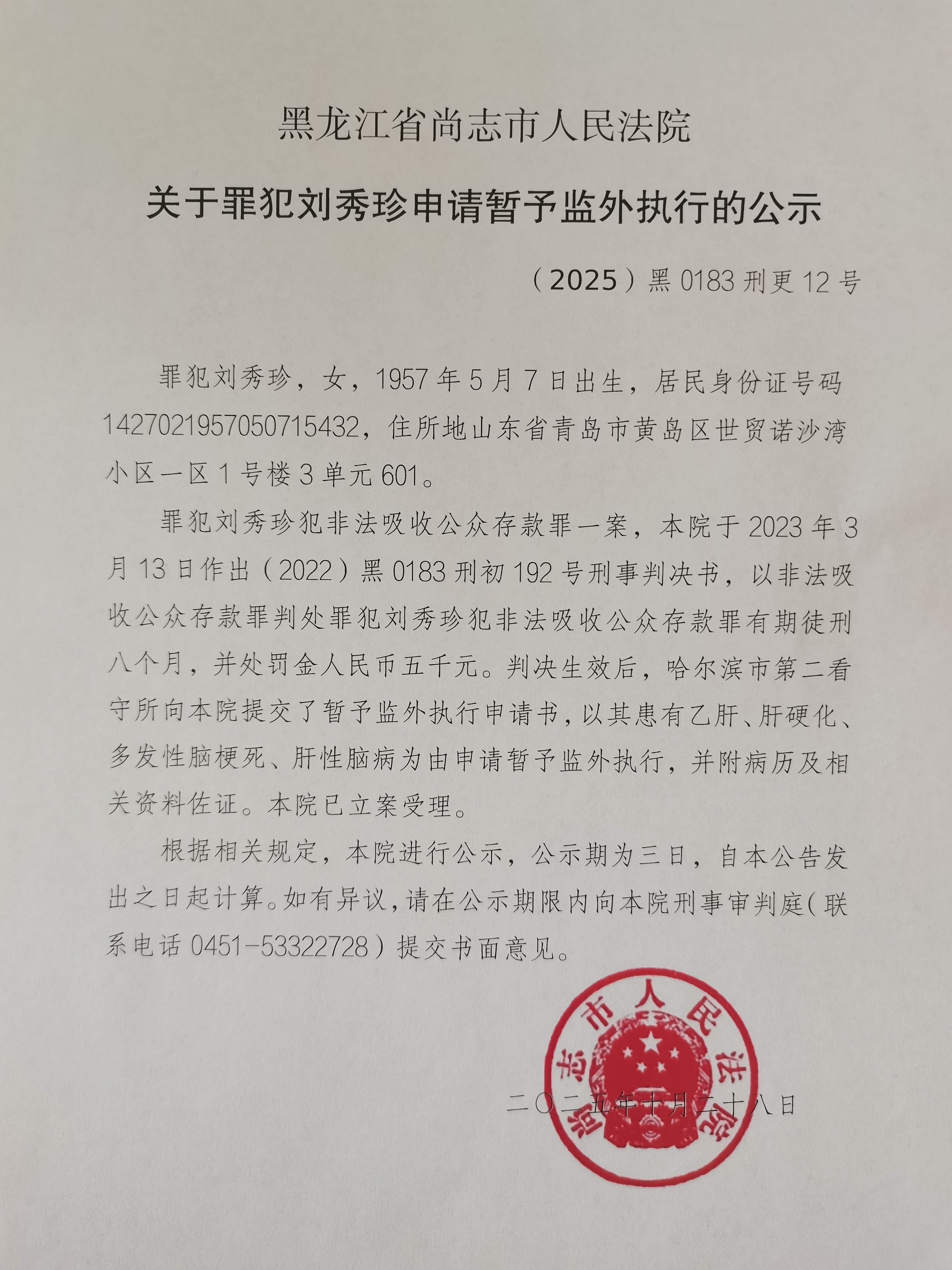 黑龙江省尚志市人民法院关于罪犯刘秀珍申请暂予监外执行的公示