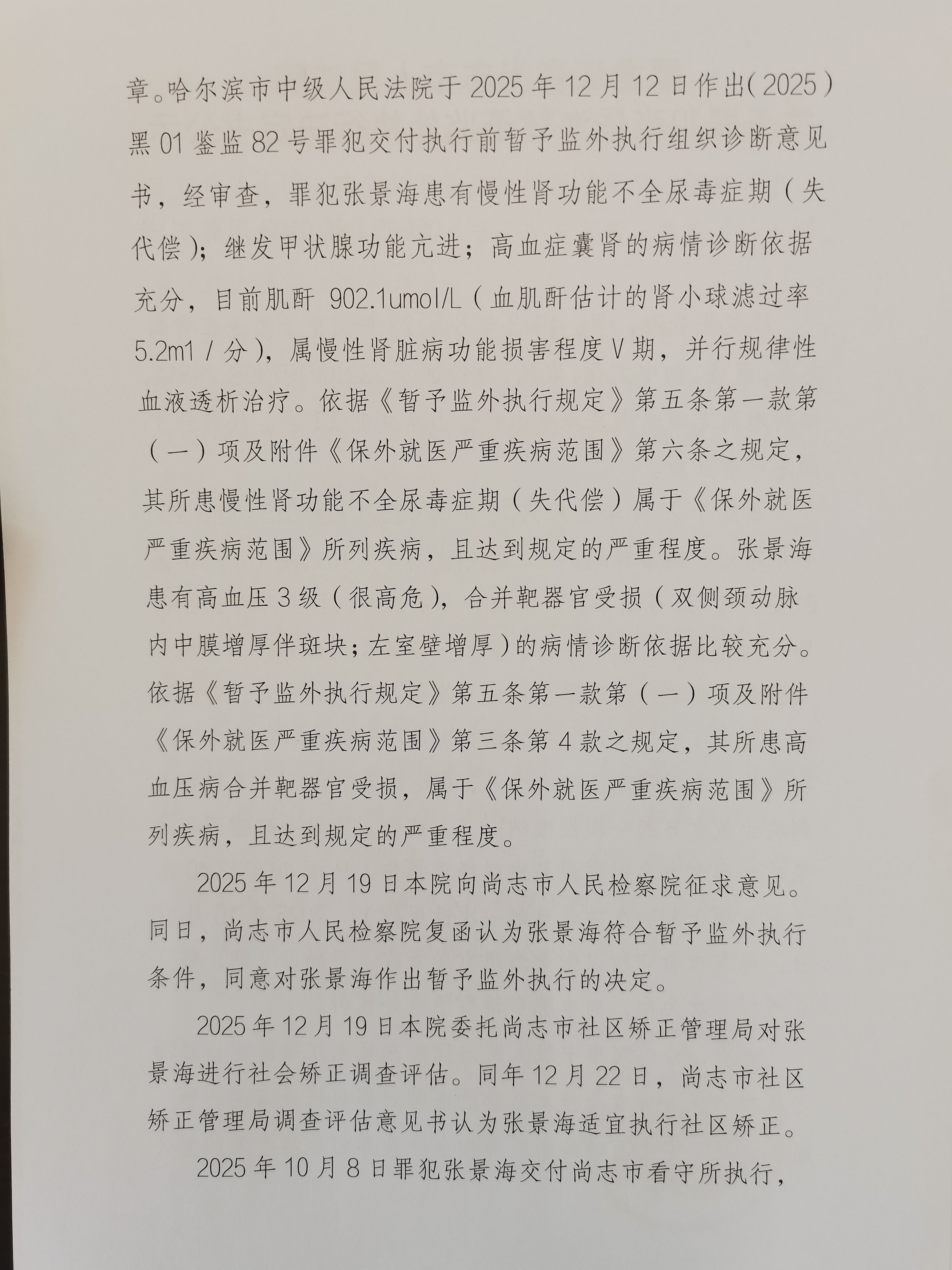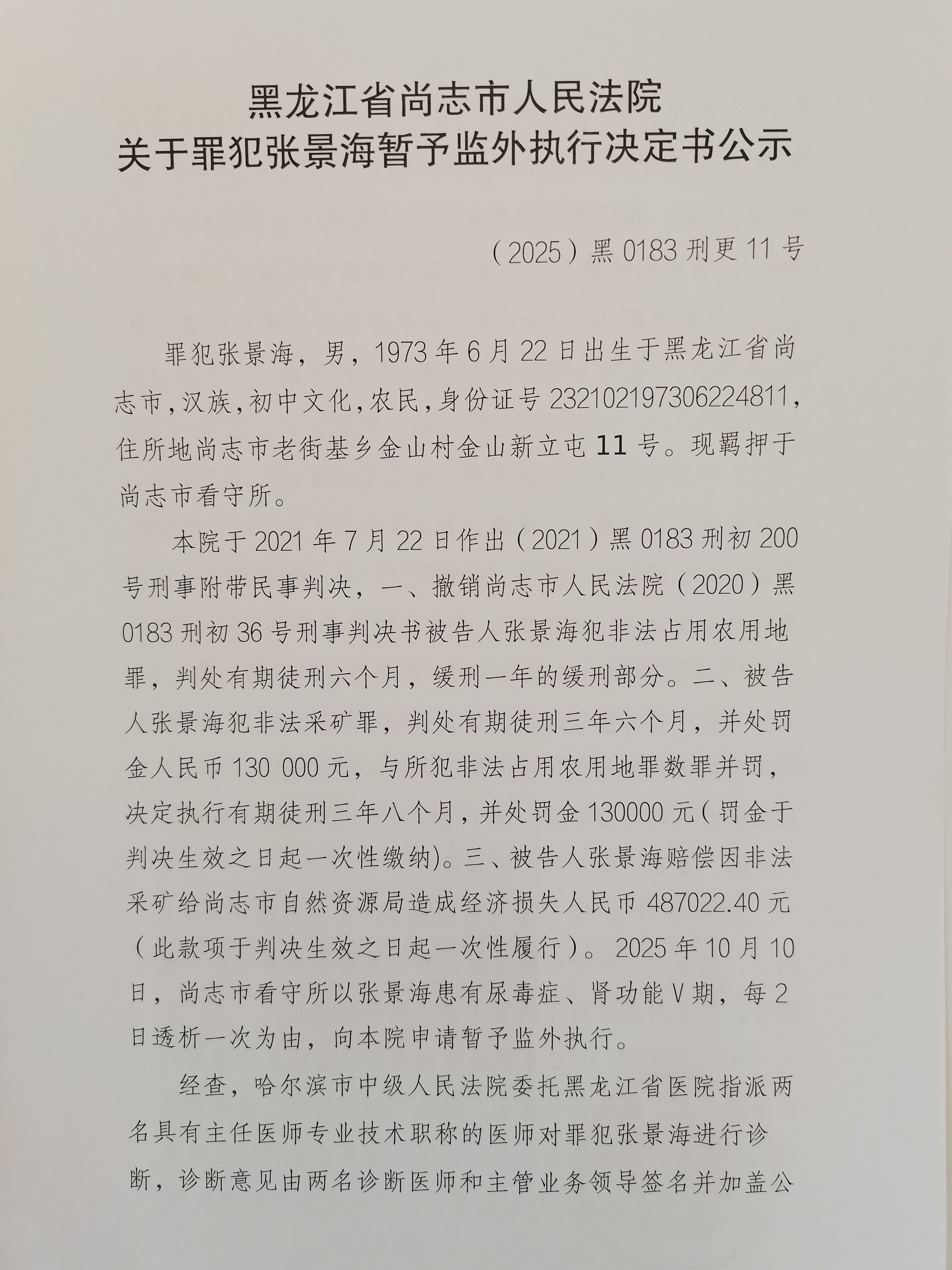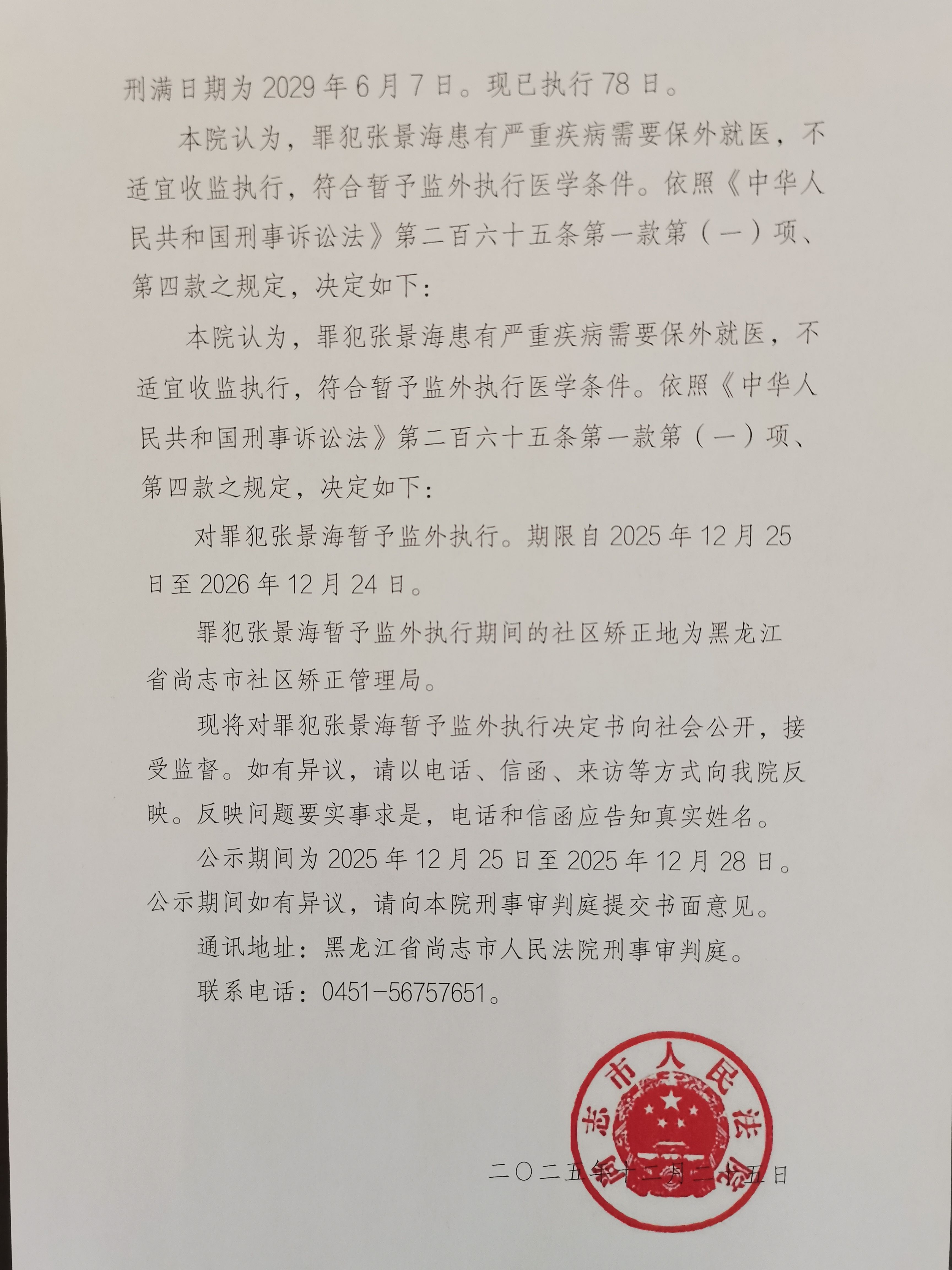 黑龙江省尚志市人民法院关于罪犯张景海暂予监外执行决定书公示