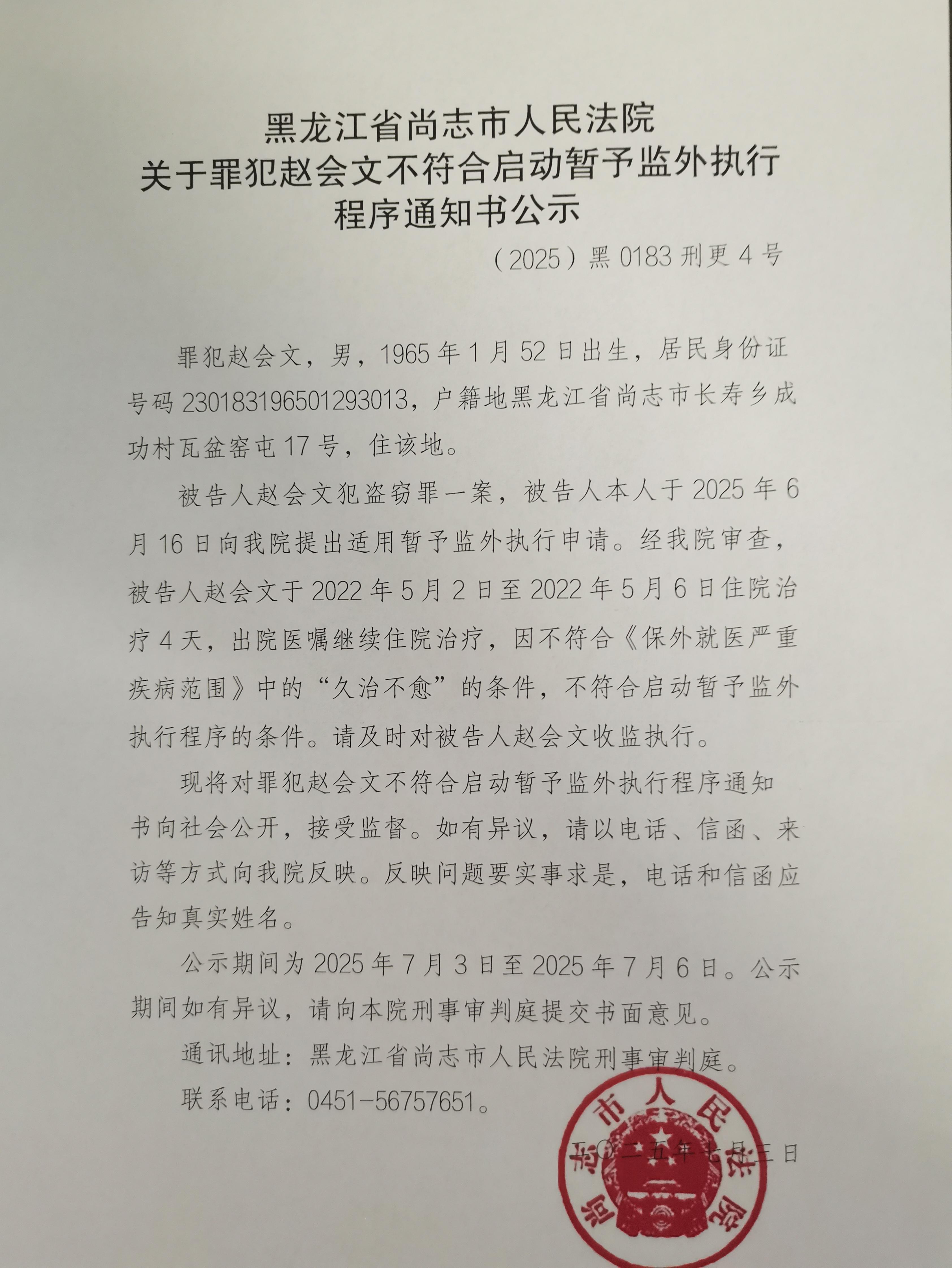 黑龙江省尚志市人民法院关于罪犯赵会文不符合启动暂予监外执行程序通知书公示