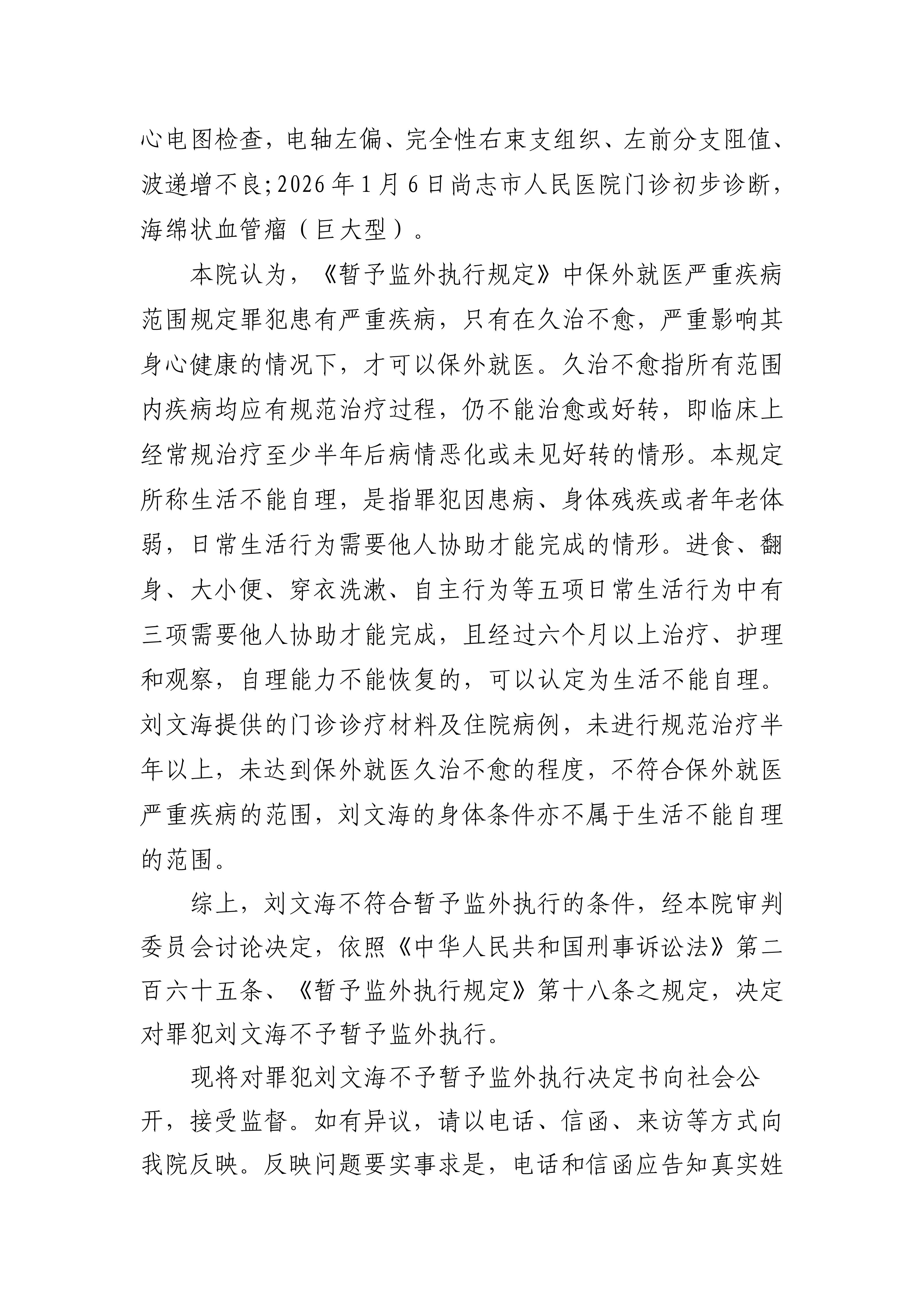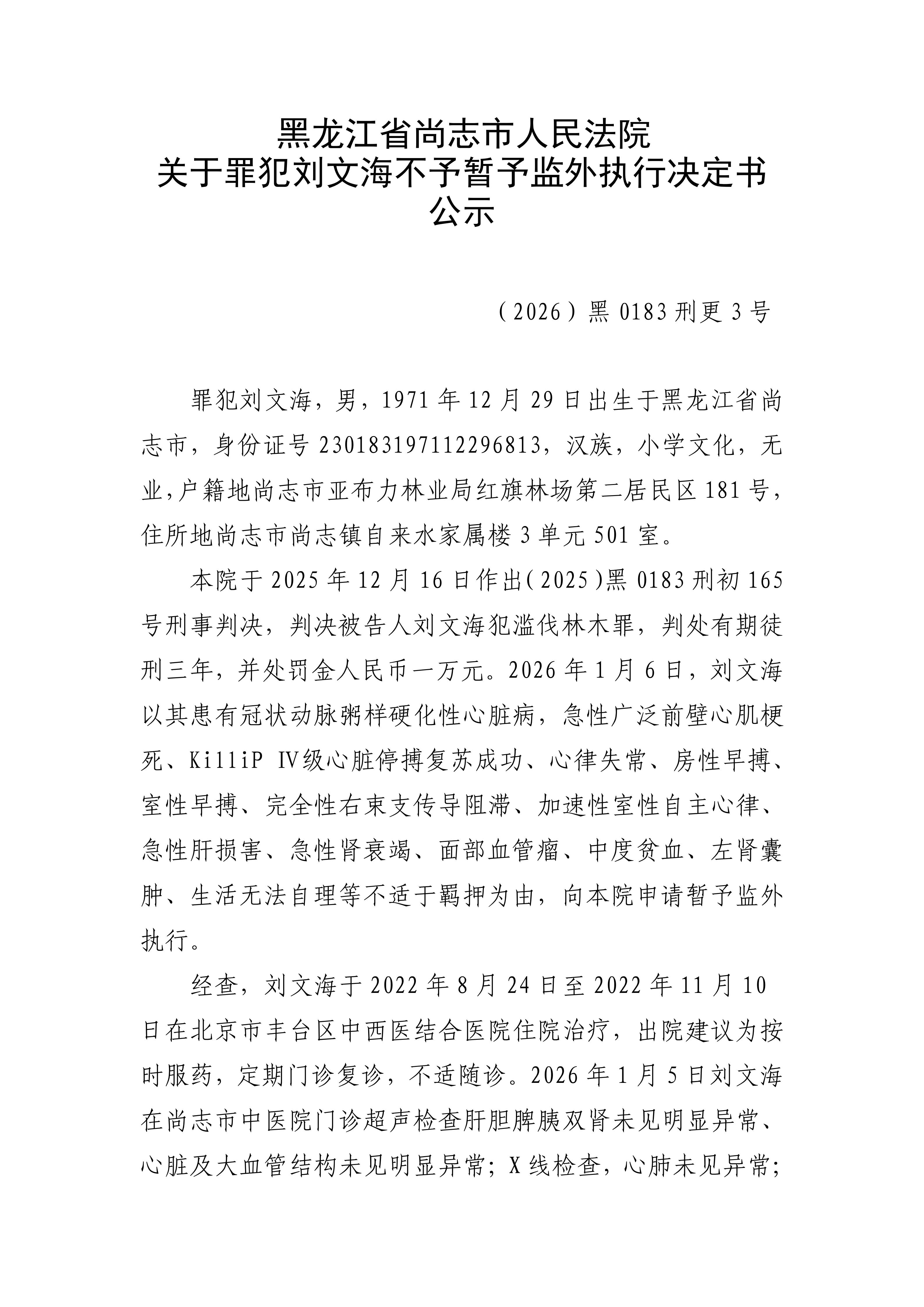 黑龙江省尚志市人民法院关于罪犯刘文海不予暂予监外执行决定书公示